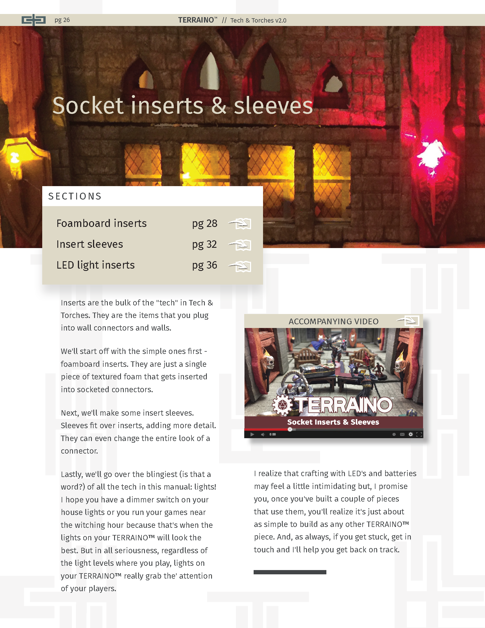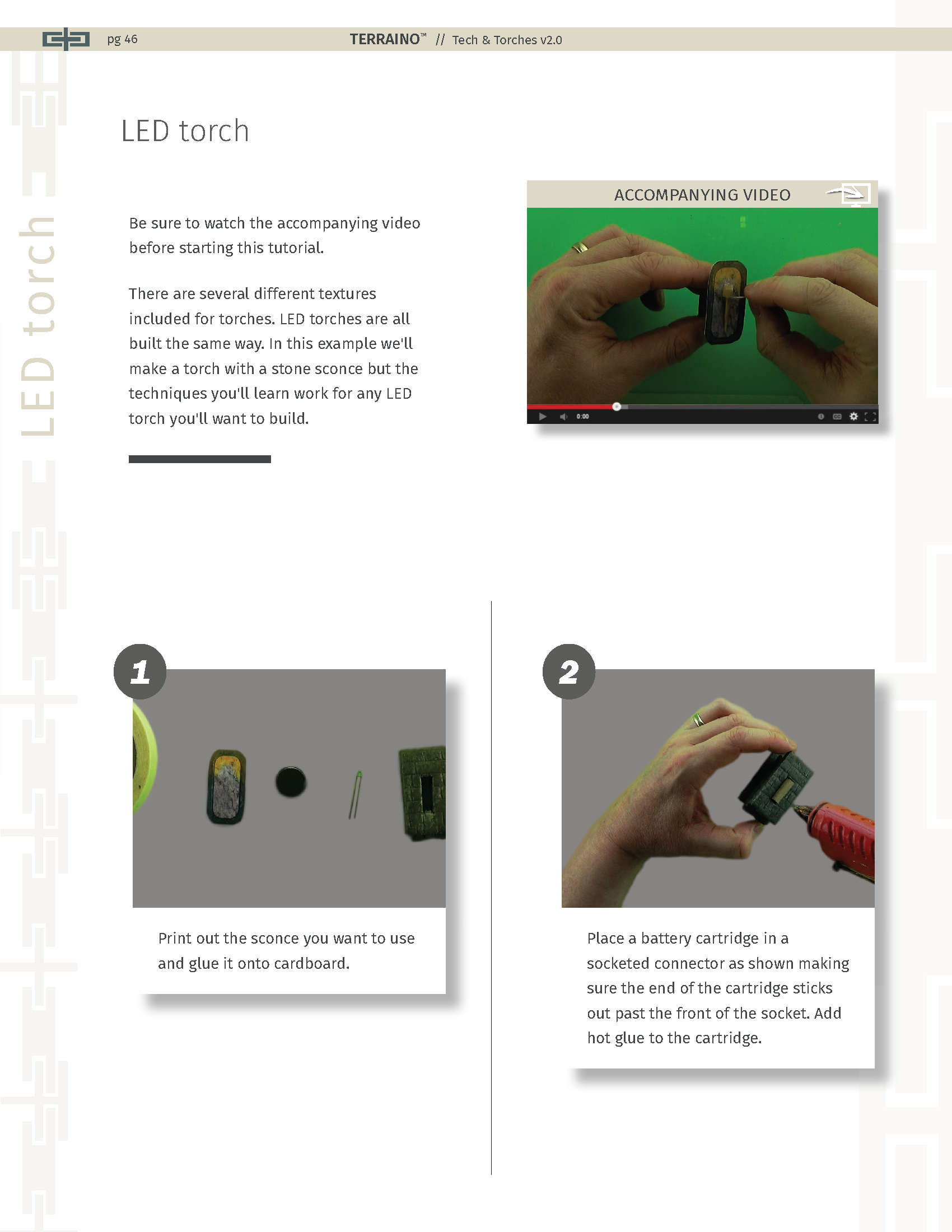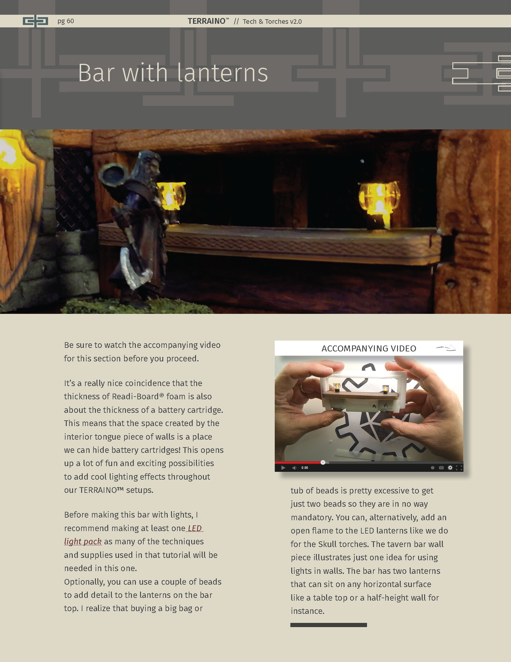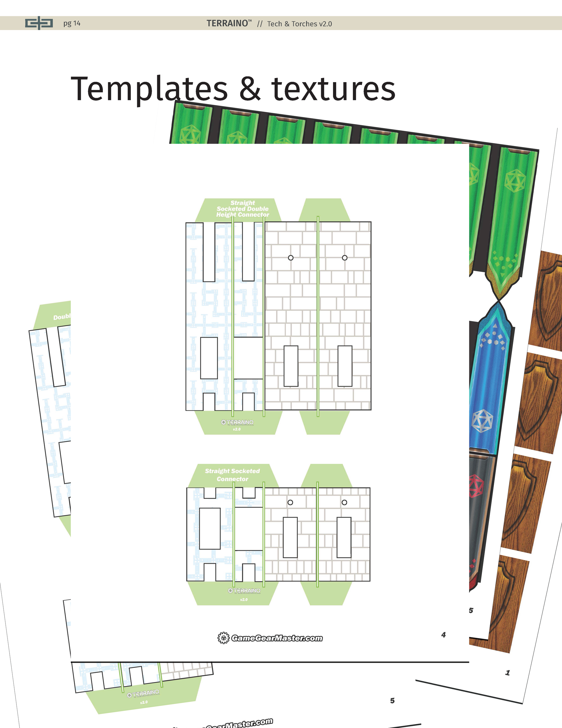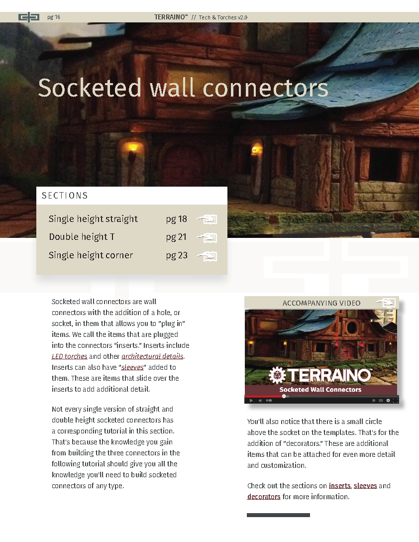 Step-by-step guide with included tools, templates, textures, and videos to bling out your TERRAINO tabletop terrain set! Learn to build single and double-height wall connectors. Then learn to build self-lit torches, lanterns, architectural accents, banners, and more that you can insert into socketed connectors to add tons of detail and really up the "wow" factor of your tabletop terrain.