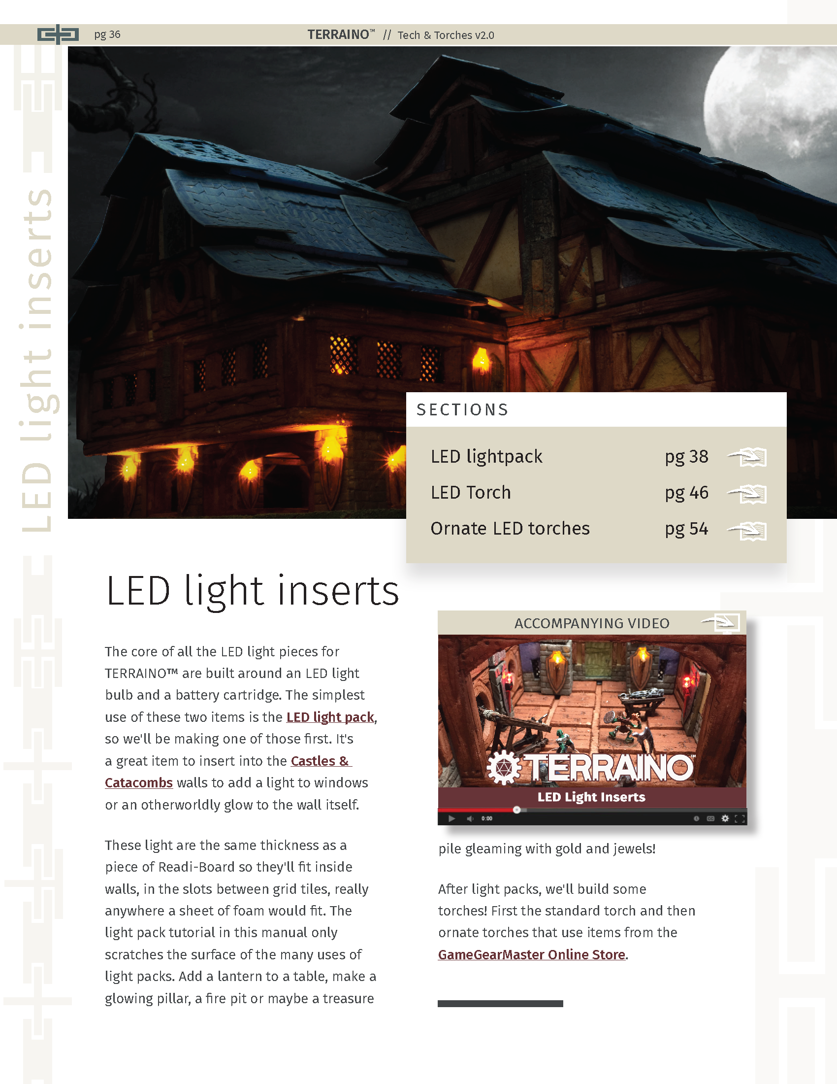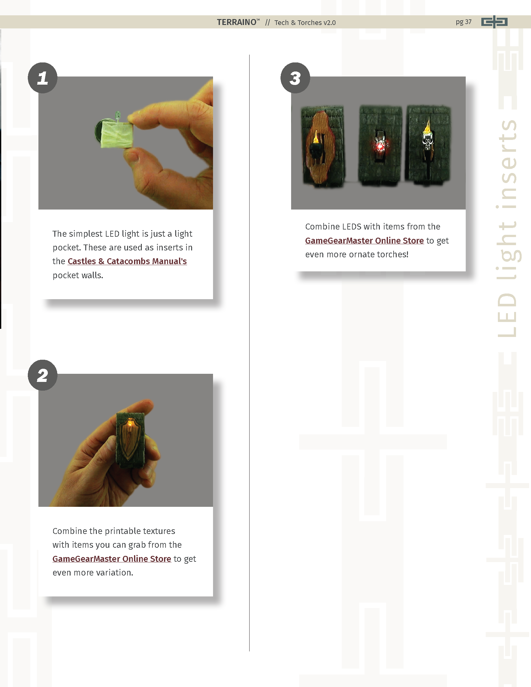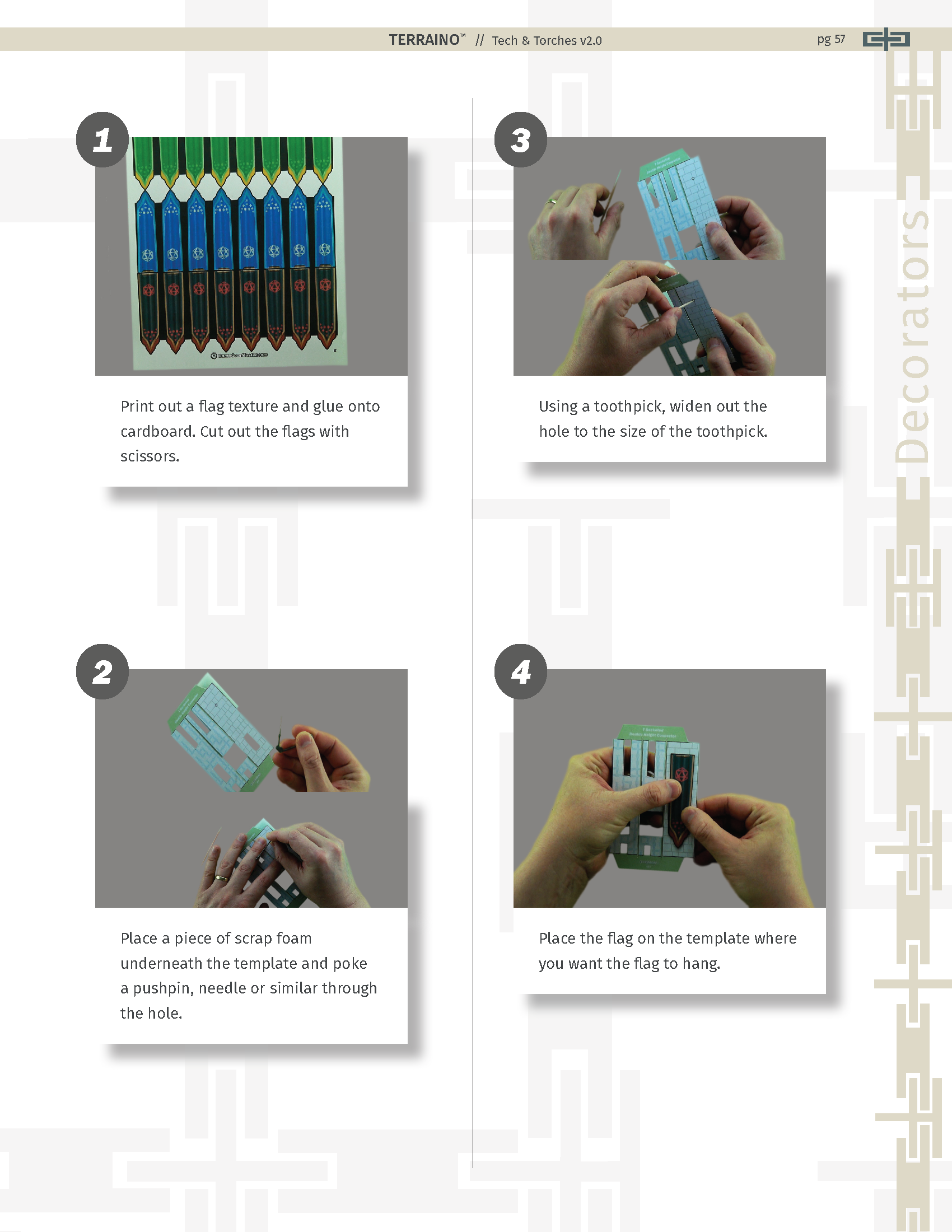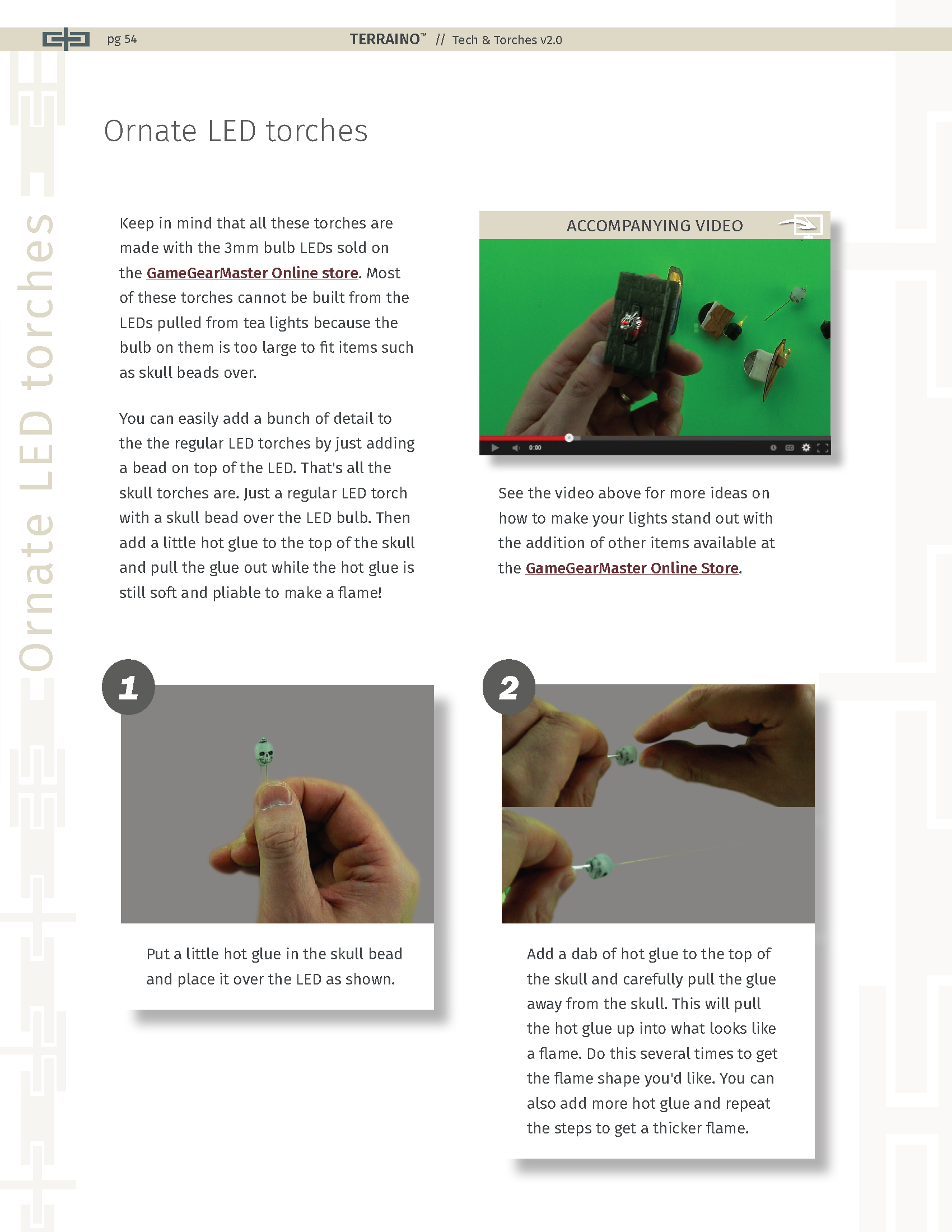 Step-by-step guide with included tools, templates, textures, and videos to bling out your TERRAINO tabletop terrain set! Learn to build single and double-height wall connectors. Then learn to build self-lit torches, lanterns, architectural accents, banners, and more that you can insert into socketed connectors to add tons of detail and really up the "wow" factor of your tabletop terrain.